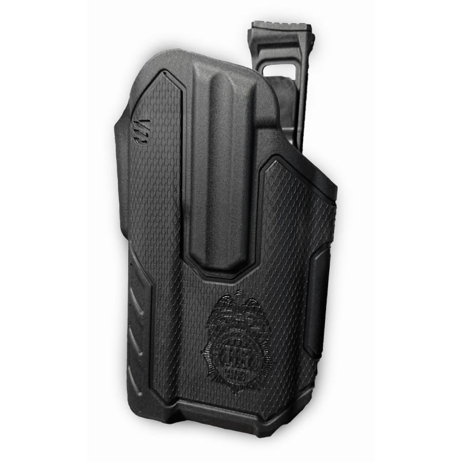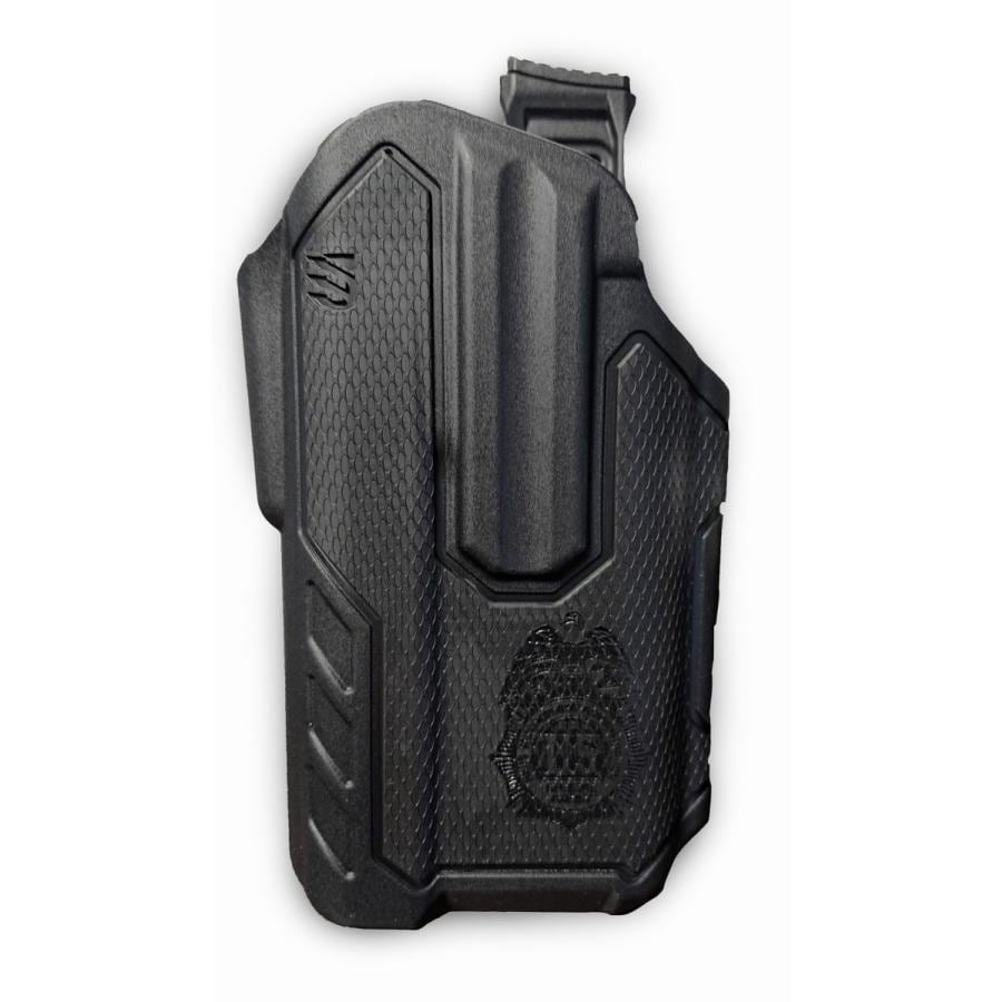 ブラックホーク製実物ホルスターにLEのアイコニックな刻印を施しています。
