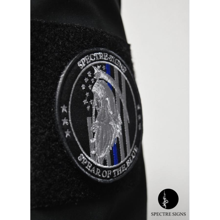 「シンブルーライン」と呼ばれる法執行のサポートを象徴した色がモチーフのモラルパッチです。高品質の光沢糸を使用し、ハンドメイドで仕上げています。背面ベルクロ仕様。