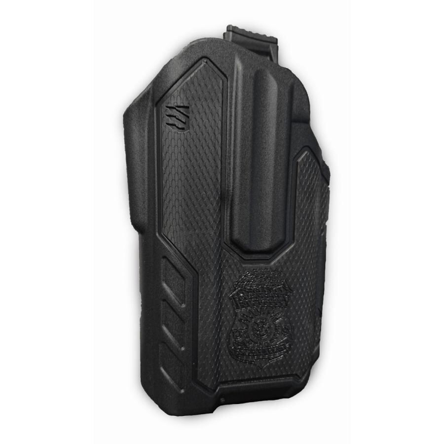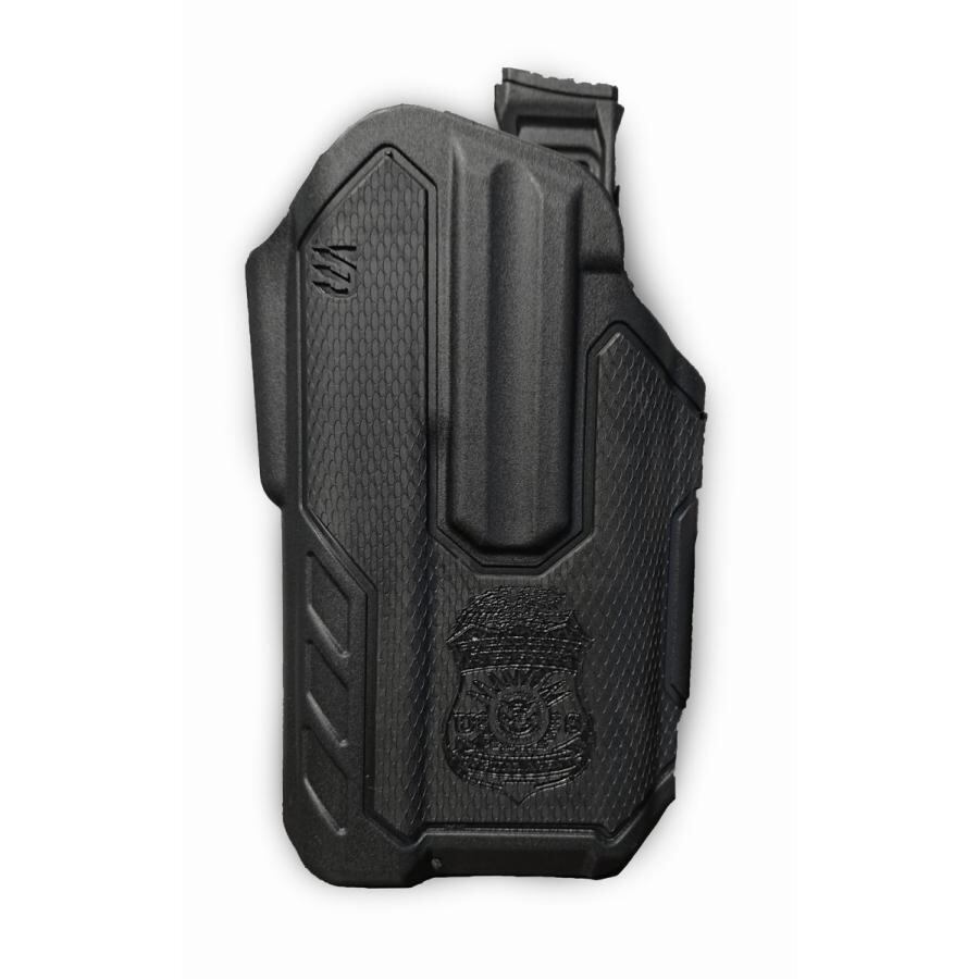 ブラックホーク製実物ホルスターにLEのアイコニックな刻印を施しています。
