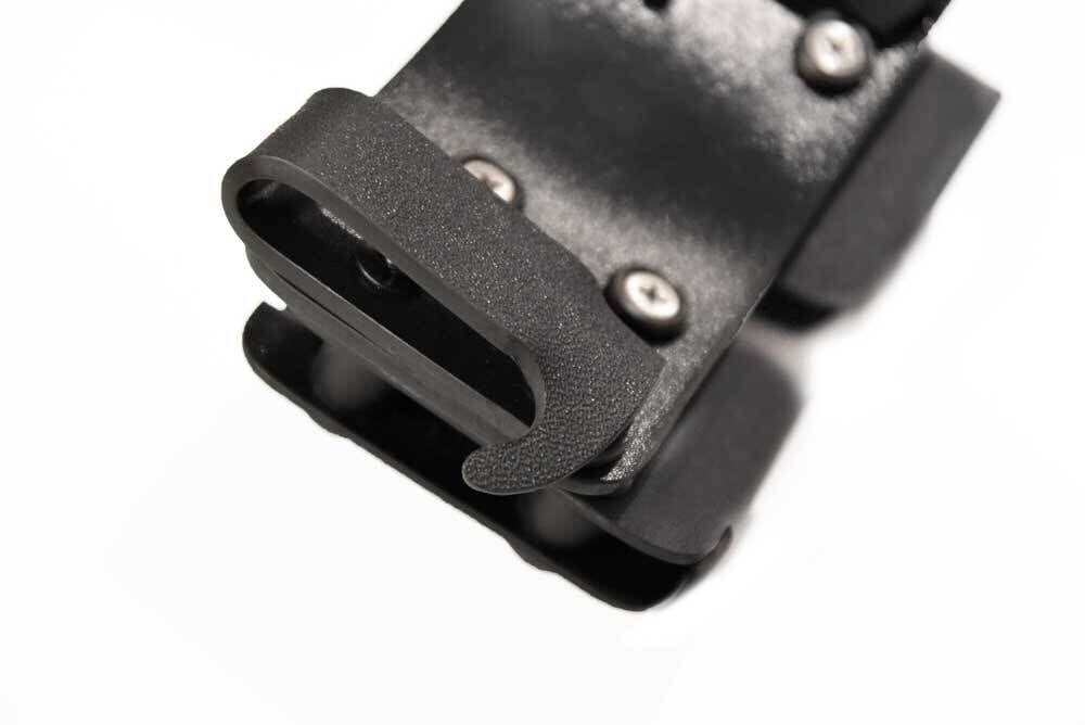 角度が無段階に調整できるオリジナルのマガジンポーチ(キャリア)です。ベルトが無いパンツでも装着できる設計です。スクリューを締めたり緩めたりしてマガジンへのテンションを変えられます。シンプルなカイデックス製で汚れても丸洗いが可能です。パンツフックを変更すればベルトなど様々な取り付け方法に変更できます。